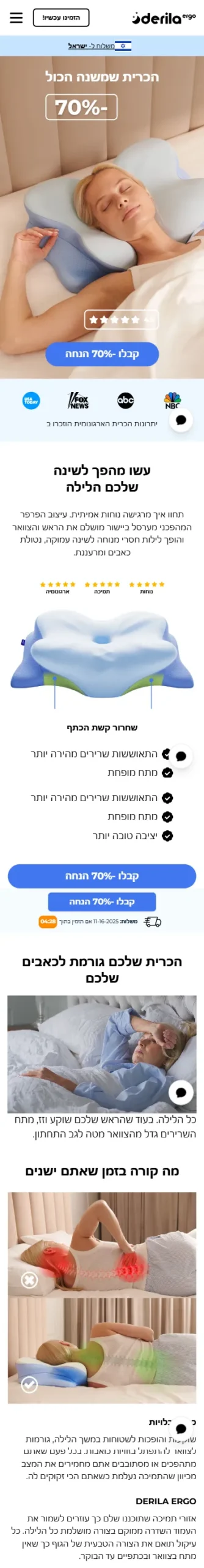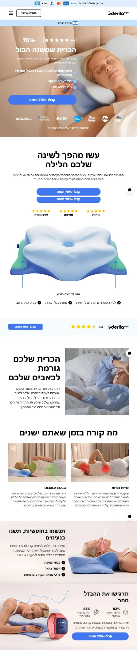 Derila Ergo Pillow הוא כרית ארגונומית פרימיום המוצעת בישראל כחלק מהצעה רשמית הכוללת מידע ברור על המחיר, ההנחה, תנאי המשלוח והאחריות. מטרת הטקסט היא להציג מידע מדויק ושקוף על המוצר מבלי לכלול הבטחות רפואיות או טענות שאינן מבוססות. כל המידע מותאם לשוק הישראלי ונכתב בשפה העברית.