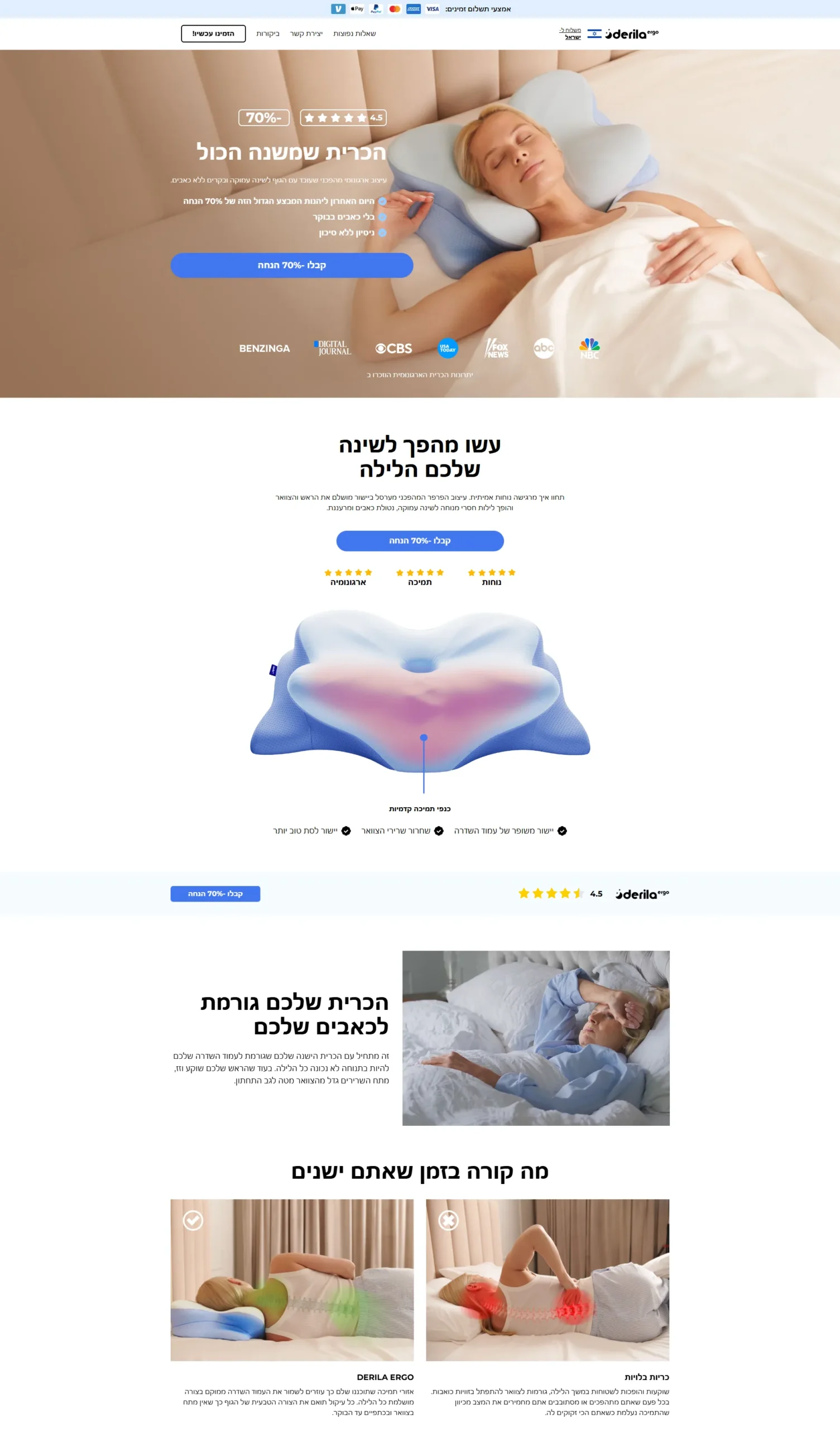 ההצעה הרשמית של Derila Ergo Pillow בישראל כוללת מחיר מקורי, הנחה משמעותית ברכישת מספר יחידות, משלוח בעלות קבועה ואחריות של 60 ימים. כדי לבדוק את מחיר העדכני או לבצע הזמנה, מומלץ תמיד להיכנס לאתר הרשמי.